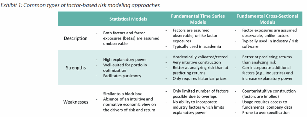 Scientific Portfolio recognizes that building a risk model is perhaps as much of an art as it is a science. There are three common types of factor models used by academics and industry practitioners: i) statistical models, where both factors and factor exposures, i.e., betas, are assumed unobservable and need to be estimated, ii) fundamental time series models which are popular with academics and where factors are assumed observable but not betas, and iii) fundamental cross-sectional models, used by popular risk engines in the industry and where betas are assumed observable but not factors. Exhibit 1 provides a more detailed description and a comparison of the strengths and weaknesses of the three approaches for designing a risk model.