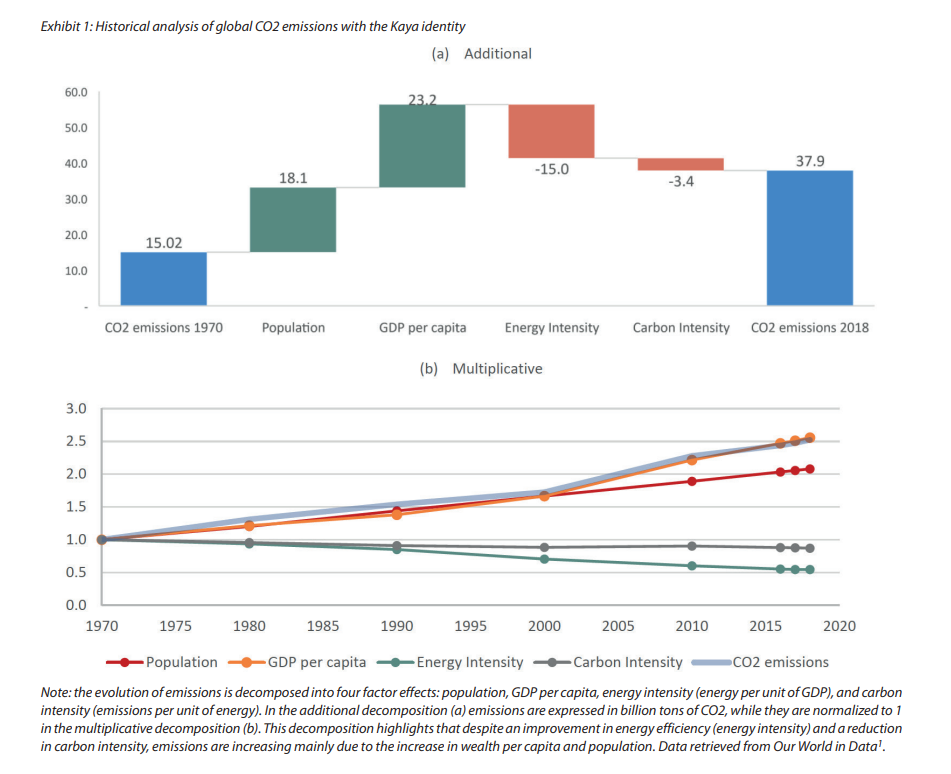 Over the last 25 years, research in environmental economics has been confronted by similar issues at the macroeconomic level and has developed decomposition methods to understand the different drivers of global emissions. One of the most famous is the “Kaya identity” (Exhibit 1), that expresses global emissions as the product of four factors: population, GDP per capita, energy intensity, and carbon intensity (Kaya, 1990).